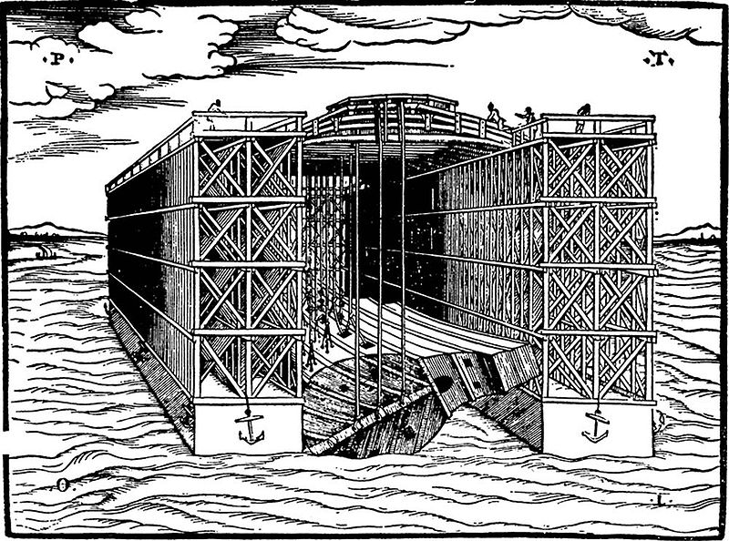 La primera reseña que encontramos de un dique flotante nos llega de un libro impreso en Venecia en 1560 titulado Descrittione dell’artifitiosa machina, en donde se habla de un nuevo método para la recuperación de naves hundidas y aparece un grabado en el que se ve un buque flanqueado por dos estructuras de madera que soportan un techo desde el que se lanzan cuerdas que soportan el buque en posición vertical.