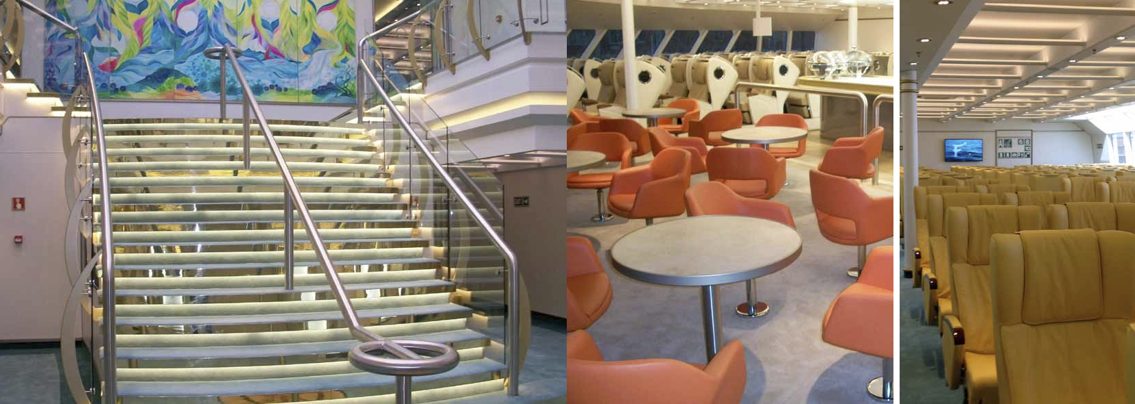 Ascendiendo mediante un ascensor acristalado o por las escaleras subimos a la cubierta 3: a popa la clase turista; hacia proa de esta zona se encuentra el recibidor; a proa del recibidor los asientos de la clase business; y ya a proa de todo, la zona de asientos de primera clase.