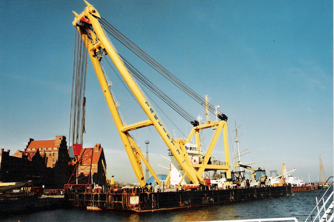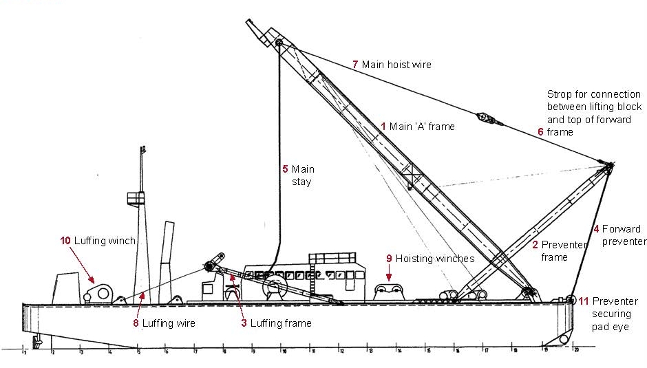- Grúas flotantes (sheerlegs): se trata de grúas fijas, sin capacidad de girar, por lo que la carga debe ser acercada a la grúa antes del izado. Pueden levantar desde las 50 hasta las 4.000 toneladas.