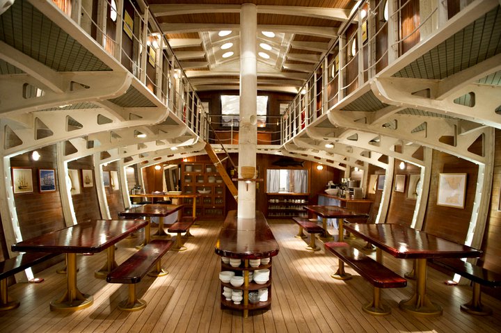 Sobre la cubierta principal, en el interior del barco, un salón comedor con cuatro grandes mesas, forrado en caoba, que hace las veces de aula formativa, alimenta a 16 tripulantes a la vez a través de una barra buffet contigua a la cocina. La cocina y los camarotes de la oficialidad también se encuentran en esta cubierta.