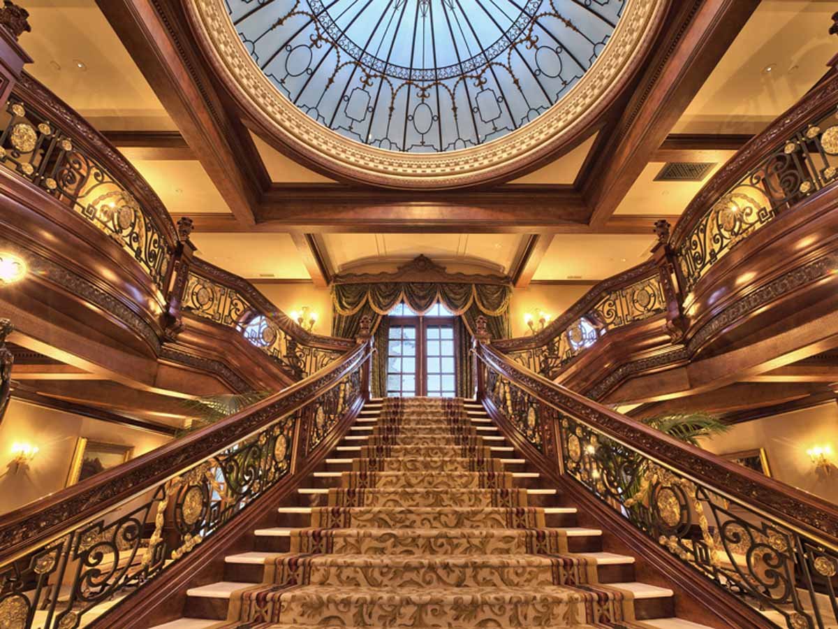Una gran escalera de madera y mármol, que se separa en dos brazos da acceso a la sala superior. Sus escalones están grabados con el nombre del buque y las siglas de la KdF alternativamente. En el comienzo de la escalera. en cada uno de los pasamanos hay un águila con las alas extendidas que sujeta una corona de laurel, que originalmente circundaban unas cruces gamadas que han sido eliminadas obviamente en la restauración.