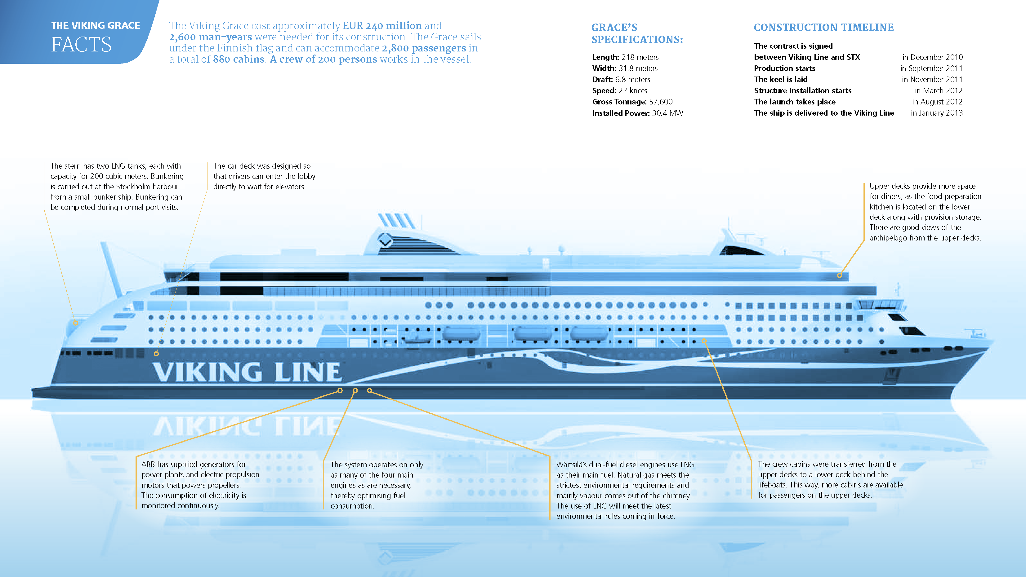 Diseñado para operar en las aguas poco profundas de los archipiélagos finlandés y sueco y construido por los astilleros de STX Europe en Turku (Finlandia), el Viking Grace navega por el Mar Báltico realizando la ruta Turku – Islas Aland (Finlandia) – Estocolmo (Suecia), transportando en su interior 2.800 pasajeros y 1.275 metros de carga rodada.