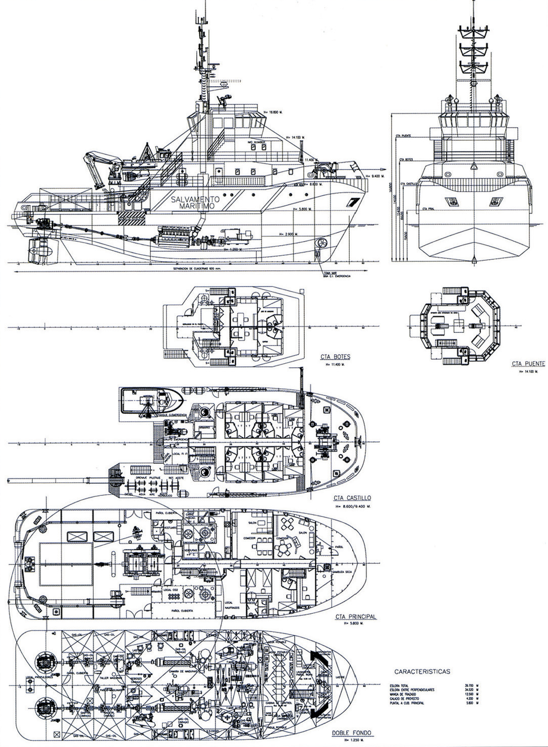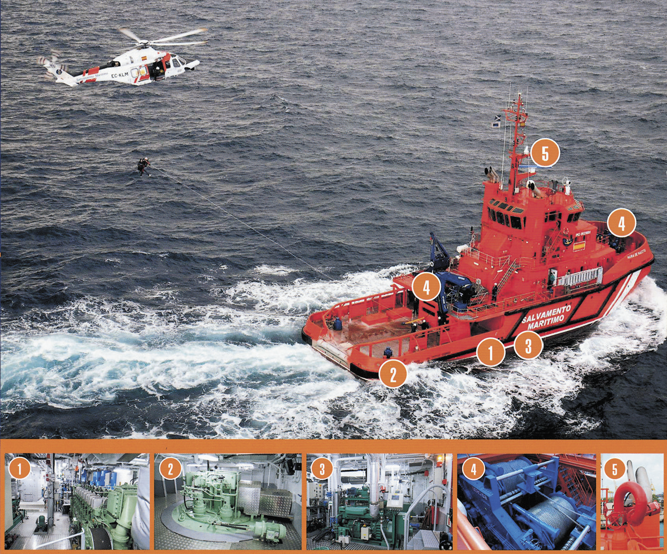 1.- Motores principales; 2.- Unidades propulsoras; 3.- Generadores; 4.- Equipo de remolque; 5.- Equipo contra incendios