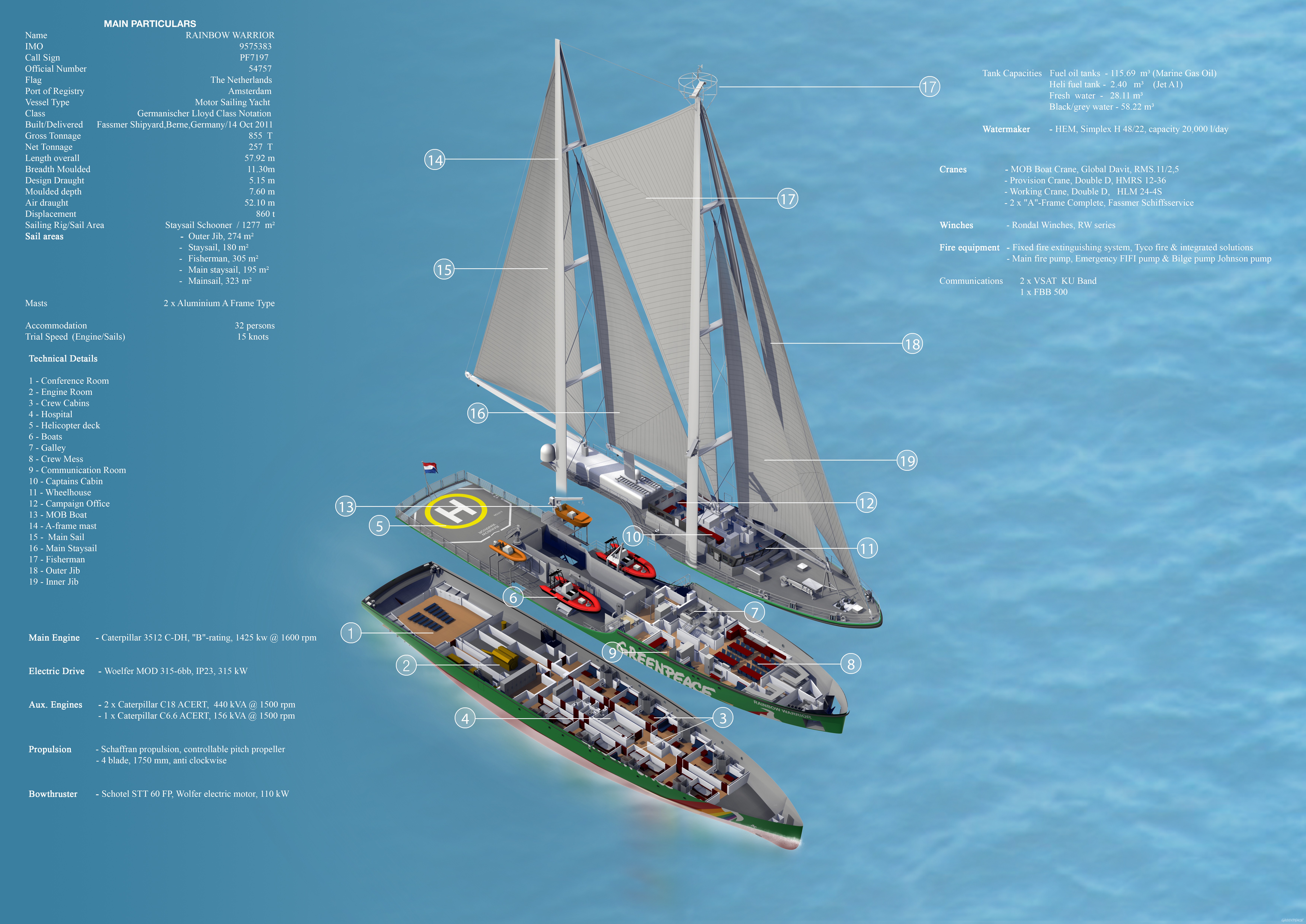 Con 58 metros de eslora por 11,3 metros de manga, el casco de acero y la superestructura y los palos de aluminio, el buque desplaza casi 850 toneladas, que son empujadas a velocidades de 14 nudos por la fuerza del viento que actúa sobre las 5 velas del Rainbow Warrior.