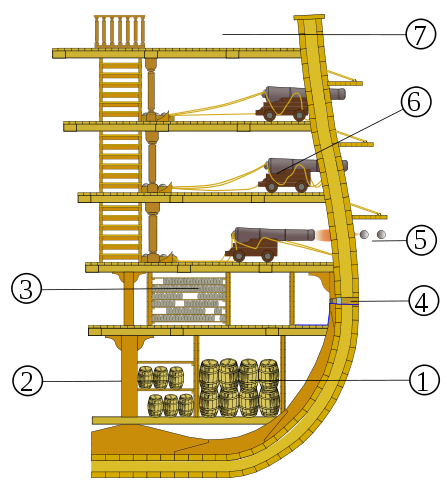 (1) Pañol de municiones (2) Santabárbara (3) Antepañol (4) Tapabalazo (5) Tiro doble (6) Cañón con cureña y aparejos (7) Cubierta Principal
