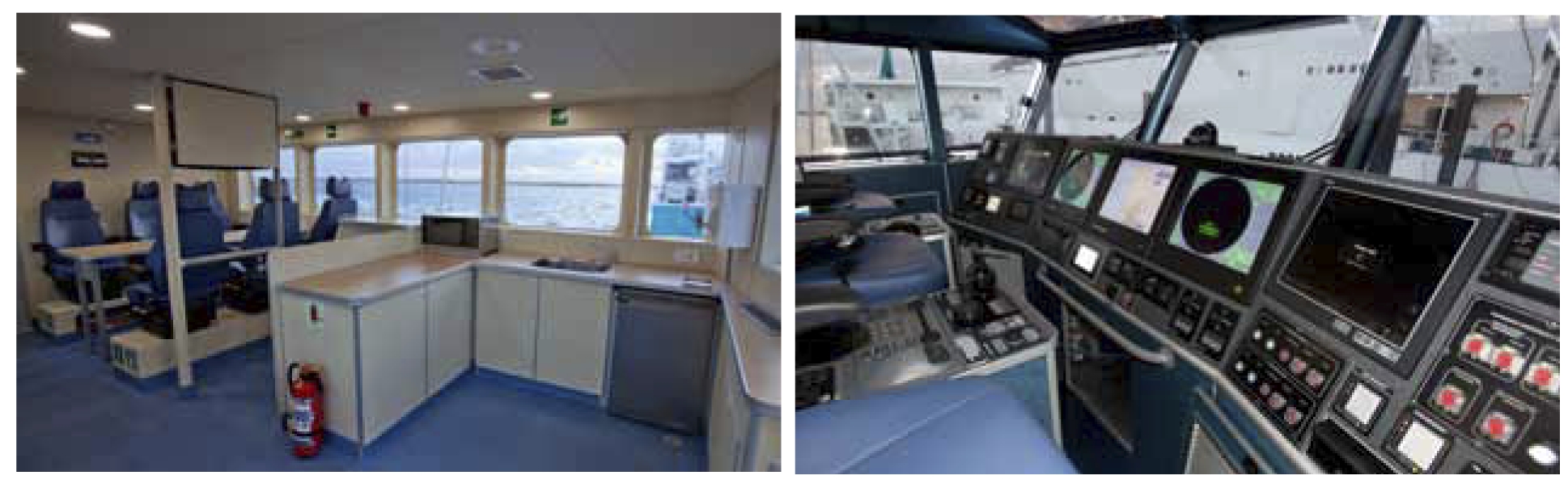 Por encima de la cubierta principal del buque se encuentra la superestructura, que aloja los espacios de cocina y comedor, la zona de los asientos para los 12 técnicos, un área con armarios para el equipaje y un baño con ducha. Sobre este nivel, en la cubierta superior se sitúa el puente de gobierno de la embarcación, con espacio para los tres tripulantes.
