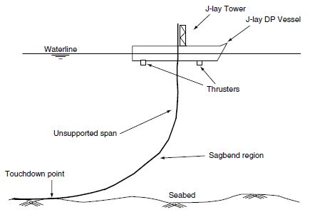 En el J-Lay, la tubería deja el barco de forma vertical, doblándose una sola vez antes de tocar el fondo, describiendo una gran jota. Cada uno de los sistemas tiene sus ventajas e inconvenientes, siendo el S-Lay el preferido para aguas de poco calado, mientras que la J-Lay es la elegida para grandes profundidades.
