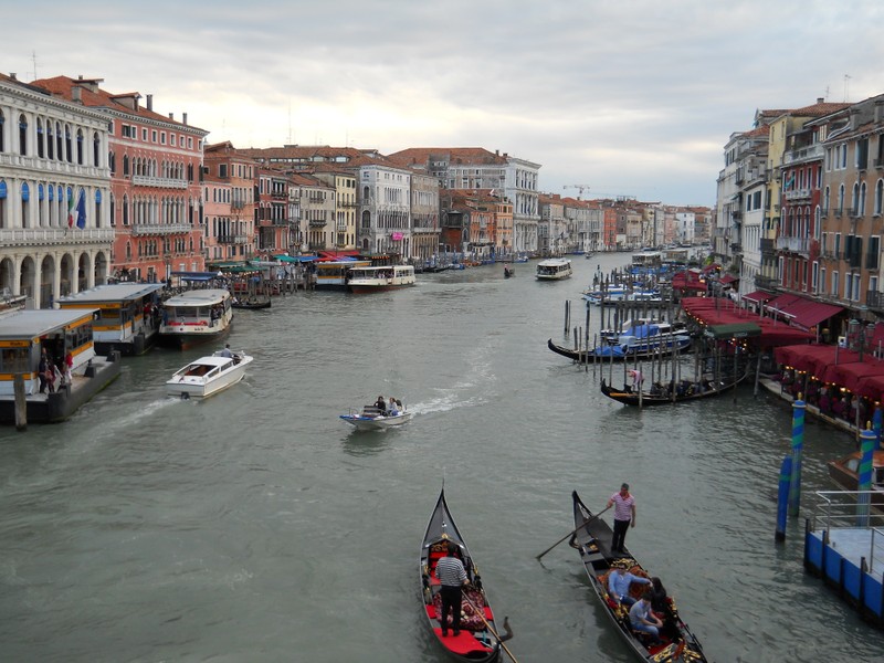 Góndolas en acción. Nótense el gondolero a babor, el remo por estribor y las camisetas a rayas. En la de la izquierda se aprecia claramente la asimetría del casco (foto por el autor)