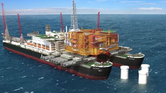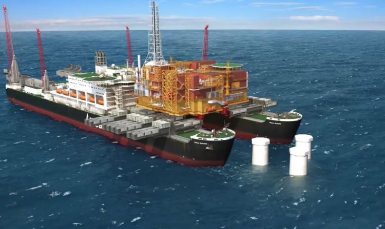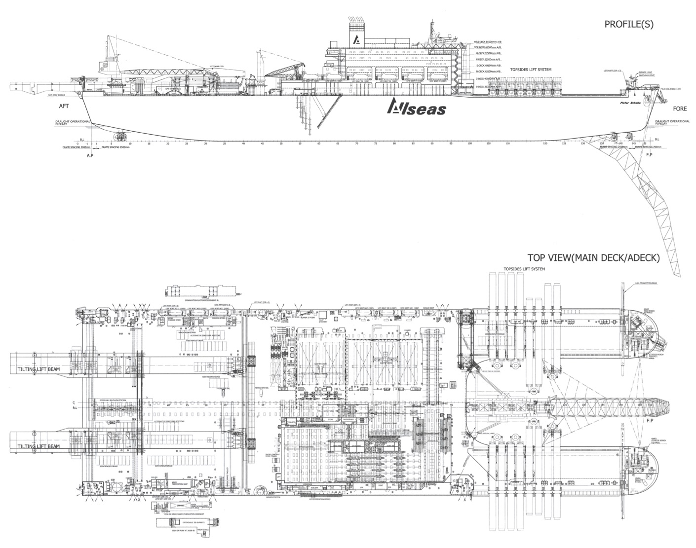 Para ello el buque lleva instalado en su proa un equipo de elevación de 122 por 59 metros consistente en un conjunto de ocho vigas elevadoras, sobre las que se colocan las topsides, de hasta 48.000 toneladas de peso.