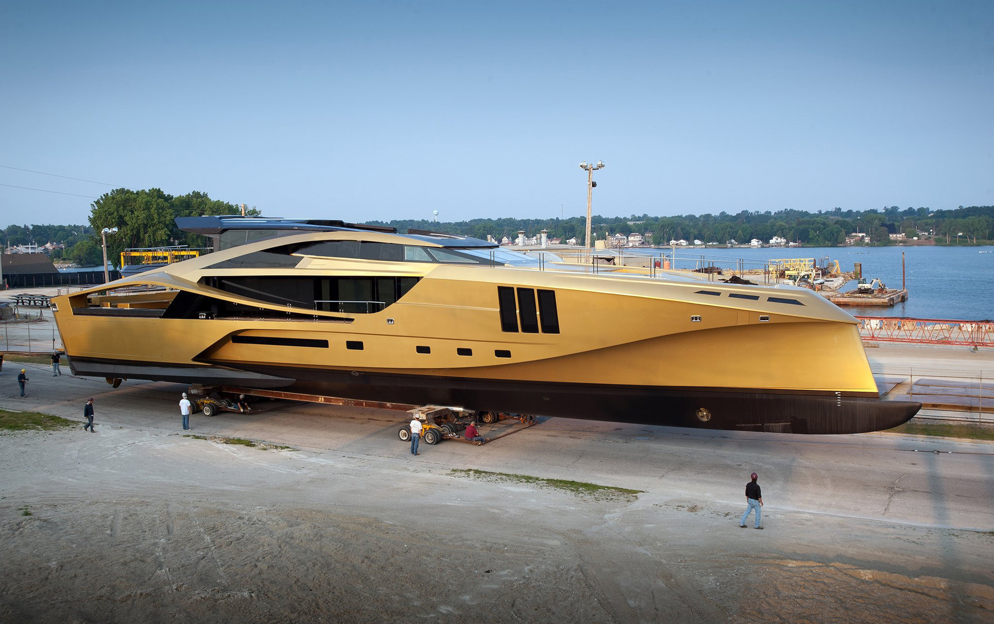El exterior del yate está marcado por sus colores dorado y negro y sus agresivas líneas. Sobre la cubierta, no hay ningún elemento que rompa su estética: ni embarcaciones auxiliares, ni grúas, anclas o cabrestantes. Todo permanece oculto en su interior.