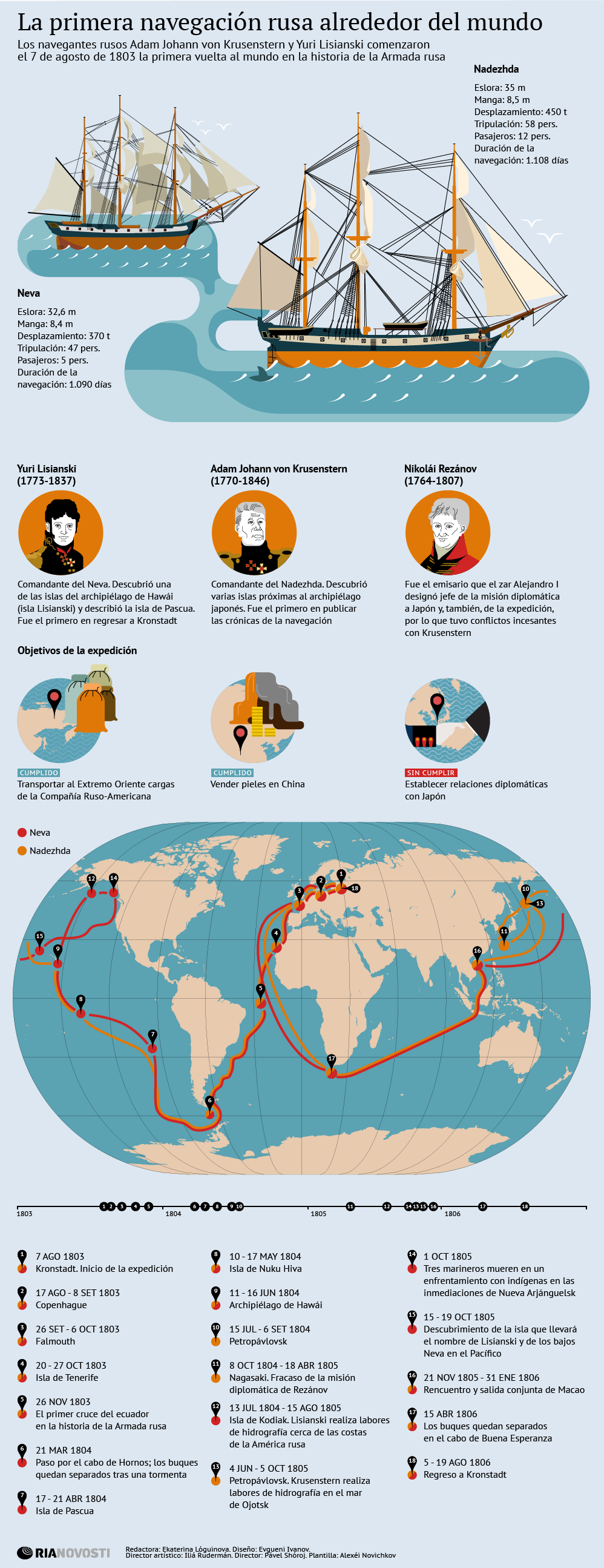 La infografía superior, publicada originalmente en sputniknews.com, recoge la primera circunnavegación rusa, un viaje de tres años (1803-1806) encabezado por Adam Johann von Krusenstern al mando del Nadezhda y el teniente capitán Yuri F. Lisianski al mando del Neva.
