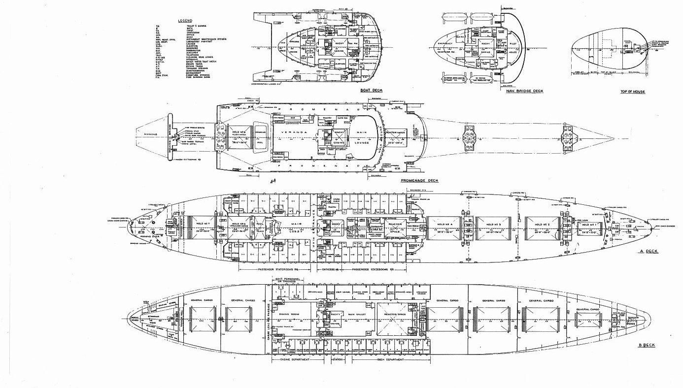 El buque se divide horizontalmente en nueve compartimentos estancos (siete bodegas, el espacio para el reactor y la cámara de máquinas) y nueve cubiertas (tres de ellas por debajo de la cubierta principal, y las otras cinco por encima). La cubierta D, la más baja, aloja los fondos de los espacios de carga, la cámara de máquinas y el reactor. En la cubierta C, la siguiente hacia arriba, se encuentran parte de los camarotes de la tripulación, la lavandería y una galería acristalada con vistas a la cámara de máquinas. Sobre la cubierta B están situados la cocina y el comedor para 75 comensales, más camarotes para la tripulación y su comedor y espacios de recreo.