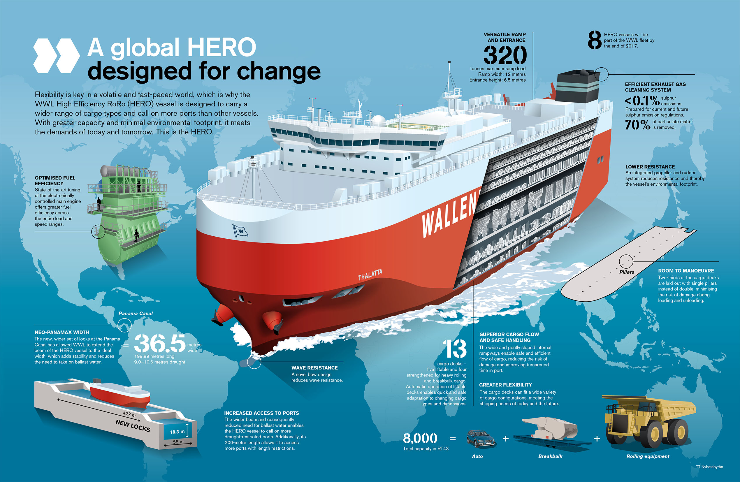 Durante más de cien años, el tamaño de las esclusas del Canal de Panamá ha sido una limitación al tráfico marino mundial. La ampliación de estas, inaugurada en junio de 2016, permite ahora el tránsito de buques de mayor tamaño, situación para la que Wallenius Wilhelmsen Logistics (WWL) se ha estado preparando desde 2010 con el diseño de una nueva generación de buques de carga rodada (RoRo), la clase HERO (High Efficiency RoRo), cuyo primer buque, el Thermopylae fue entregado a comienzos del 2015.