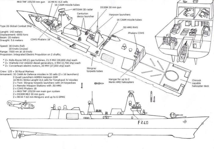 Las fragatas del tipo 26 ( 6.900 toneladas de desplazamiento) van a ser los futuros buques de combate del siglo XXI de la Royal Navy (Global Combat Ship) que reemplazará las ya obsoletas fragatas de la clase 23, estando prevista la puesta en servicio de la primera unidad de la serie, compuesta inicialmente por ocho unidades, en el año 2020.