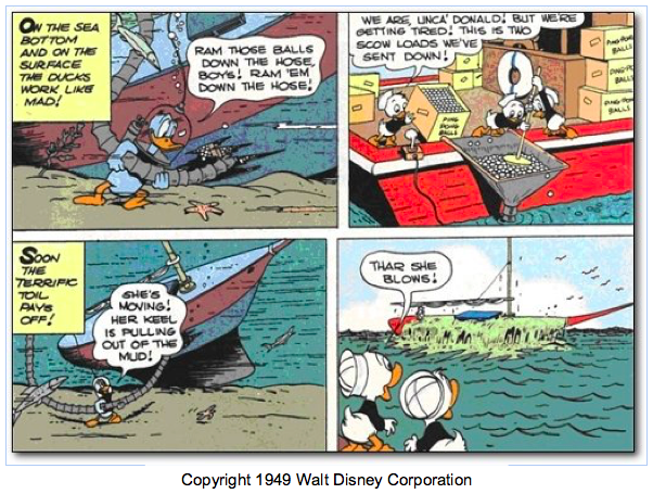 1. Bueno, recuerdo en un articulo de los 60 que hablaba sobre el rescate del Wasa (o Vasa), el galeon sueco hundido poco despues de la botadura y que sacaron entero. En el articulo comentaban que alguien propuso llenar el barco de pelotas de golf, aunque se considero la idea absurda y se saco con ayuda de unos pontones. Como el Wasa se saco en 1961, eso significa que la idea era conocida en los 50, bien sea por el comic de Disney o por otra cosa.