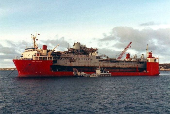 Con 139 metros de eslora por 32,2 metros de manga, el Dan Lifter (1982) de Wijsmuller protagonizó la primera gran carga de un barco sobre otro barco cuando en 1983 transportó desde las islas Malvinas al buque de asalto británico Sir Tristram de 6.400 toneladas de desplazamiento, gravemente dañado en la guerra contra Argentina.
