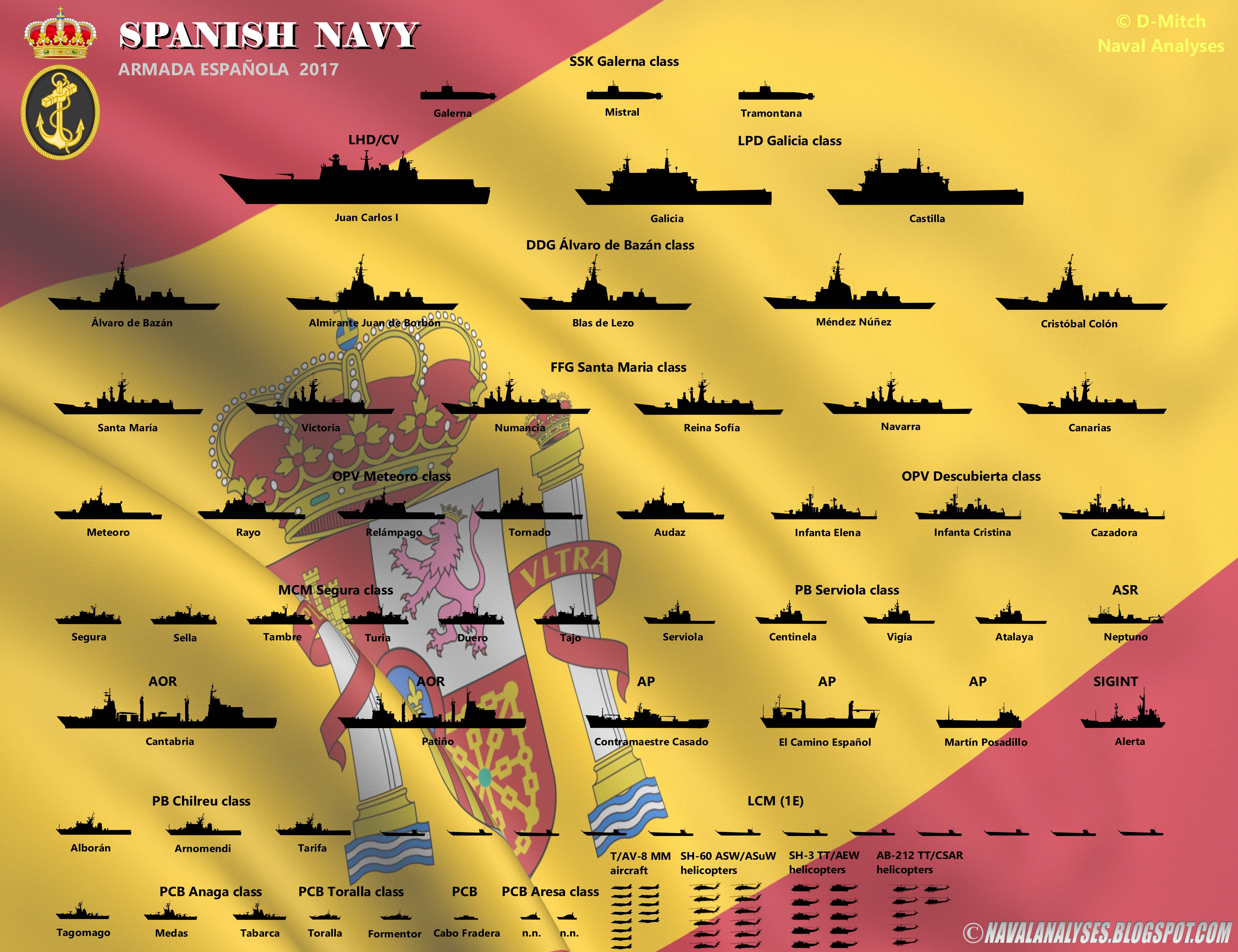 Naval Analyses (podéis encontrarlos en twitter o en su blog navalanalyses.blogspot.com.es) recoge en esta imagen los buques de la Armada Española en activo. Podéis ampliar la imagen haciendo click en ella.