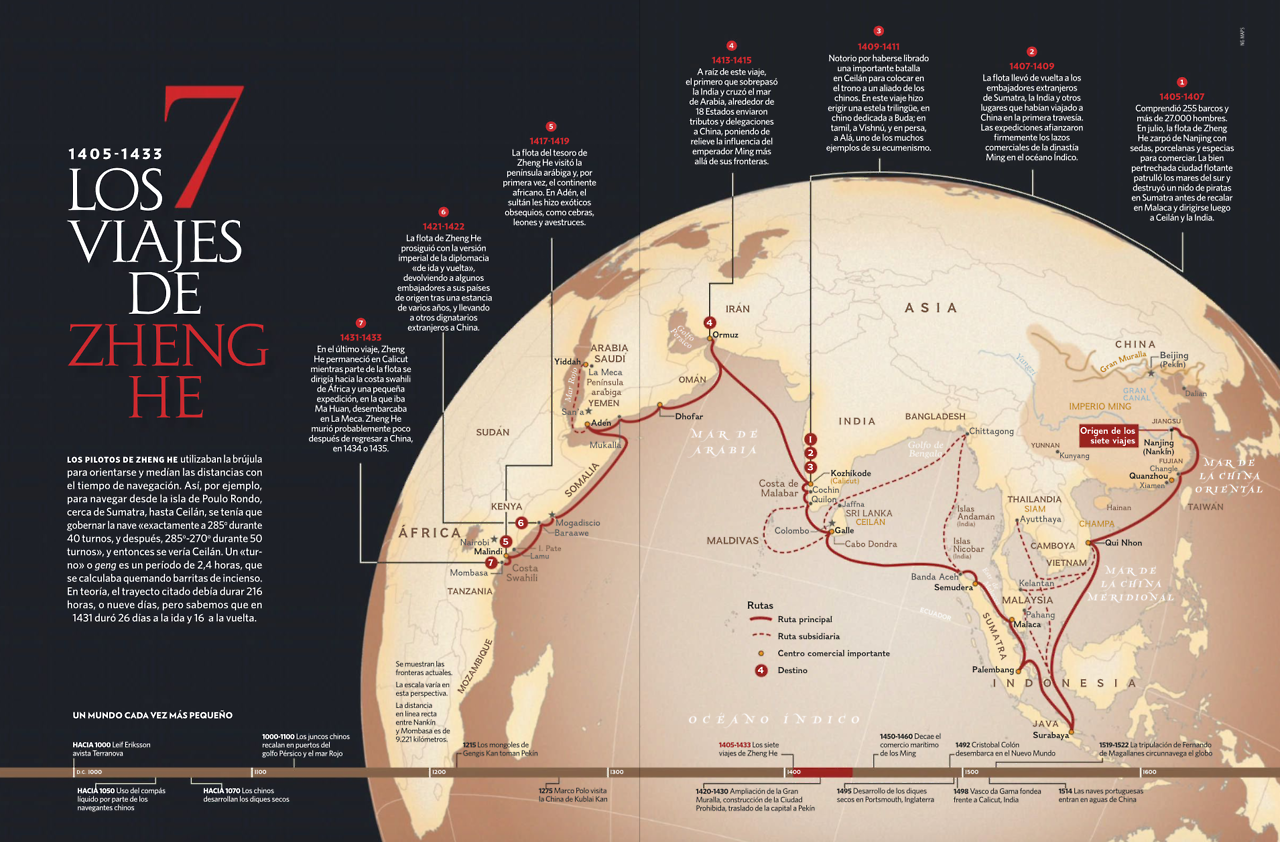 Estos siete viajes, conocidos en la tradición china como los viajes del tesoro, fueron llevados a cabo entre los años 1405 y 1433, durante la dinastía Ming. Una flota de más de 300 barcos y 27.000 tripulantes al mando del almirante Zheng He recorrió el océano Índico, llegando hasta Oriente Próximo y las costas orientales del continente africano, con la misión de proyectar el poder y riqueza chino al resto del mundo, así como controlar las principales rutas comerciales marinas de la región.