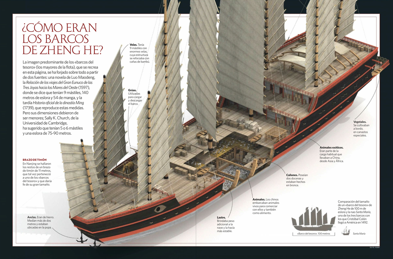 Una vez en el poder, el emperador Yongle decidió construir una gran flota con la que desarrollar nuevas vías comerciales marinas y poner a Zheng He a su mando. La flota del tesoro (así se la conocía) estaba compuesta por 300 embarcaciones de siete tipos diferentes de 50 a 135 metros de eslora: patrulleras, buques de transporte de tropas, buques tanque para el transporte de agua, cargueros, buques de transporte de caballos y los barcos del tesoro, impresionantes naves de 135 metros de eslora por 55 de manga, un tamaño que doblaba a las embarcaciones europeas de la época y los convierte en unos de los buques de madera más grandes jamás construidos.