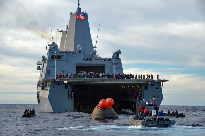 La semana pasada tuvo lugar el la costa de California uno de los diferentes tests de recuperación de la cápsula, en el que participó el buque de asalto anfibio USS Anchorage, preparándose para el amerizaje de la primera misión del Orion en diciembre de 2019, la Exploration Mission-1, en la que una nave no tripulada viajará a la Luna para luego volver a la Tierra como ensayo de la misión tripulada de 2023.
