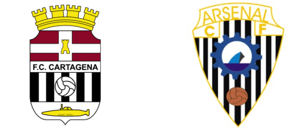 Finalizamos esta lista con dos referencias a dos de las ciudades con mayor tradición naval de nuestro país, Cartagena y Ferrol. En el escudo del FC Cartagena la imagen que podemos ver es la del submarino inventado por Isaac Peral, mientras que en el escudo del Arsenal, fundado e integrado originalmente por trabajadores del astillero de la Bazán ferrolano, puede verse en su centro la proa de un buque.
