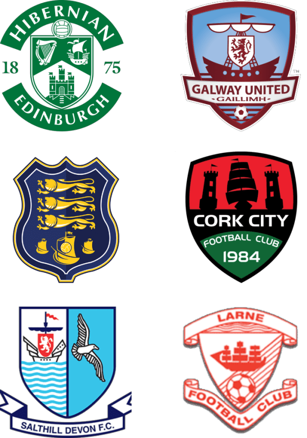 Cambiando de isla, Irlanda tiene varios equipos con barcos en sus escudos. De arriba a abajo, y de izquierda a derecha vemos el escudo del Galway United, el Waterford FC, el Cork City, el Salthill Devon y el Larne FC, todos ellos con referencias a sus puertos o a la importancia de la actividad marinera en la ciudad.