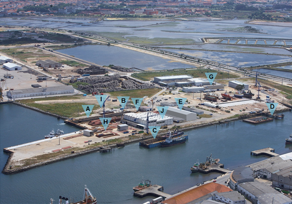 El astillero de Navalria en Aveiro (A – dique seco; B – grua pórtico; C – dique flotante; D – elevador; E – taller de bloques; F – taller mecánico; G – carpintería; H – parque de planchas; I – parque de bloques; J – almacenes)