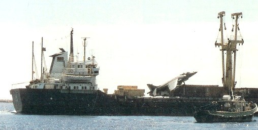 En medio de un gran estruendo, el Harrier se posó sobre los contenedores, entre el palo mayor y el castillo de popa del Alraigo. La humedad de los contenedores hizo que el caza británico se deslizara hacia atrás, cayendo de los mismos sobre una vieja furgoneta, quedando finalmente con una inclinación de 45 grados, con su cola sobre el vehículo y el morro sobre los contenedores.