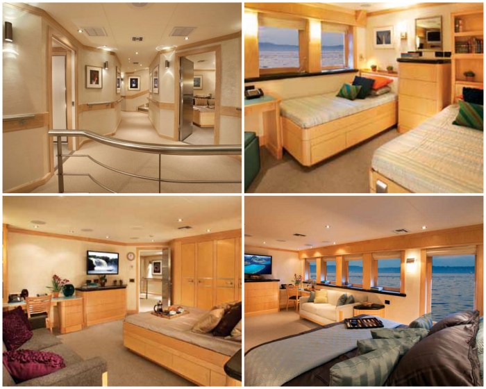 El resto de camarotes se reparten entre la cubierta principal, con cinco camarotes para la tripulación, capaces de alojar hasta a 12 personas durmiendo en literas, y en la cubierta inferior, con capacidad para otras 14 personas repartidas en camarotes a proa y a popa. En la cubierta puente se encuentran el salón y el comedor principal, justo detrás del puente de gobierno del buque. La última de las cubiertas, la cubierta de vuelo, sirve como punto de encuentro social con su bar, su comedor al aire libre y su zona de relax.