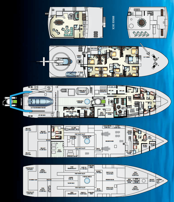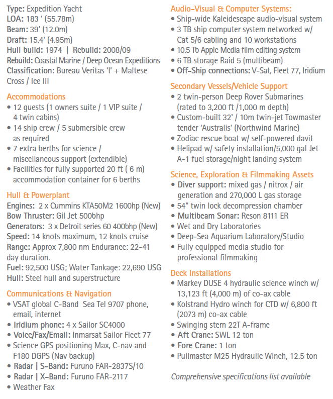 La reforma perseguía un doble objetivo. Por un lado, se necesitaba un barco capaz de alcanzar los lugares más remotos del planeta, desde los trópicos hasta los polos, y explorarlos durante largos periodos de tiempo, lo que implicaba la instalación de equipos fiables, versátiles y redundantes, así como de una habilitación del más alto estándar y comodidad. Por otro lado, los objetivos de exploración e investigación de Deep Ocean Quest exigían que el buque funcionara como buque oceanográfico y como buque nodriza de sumergibles.