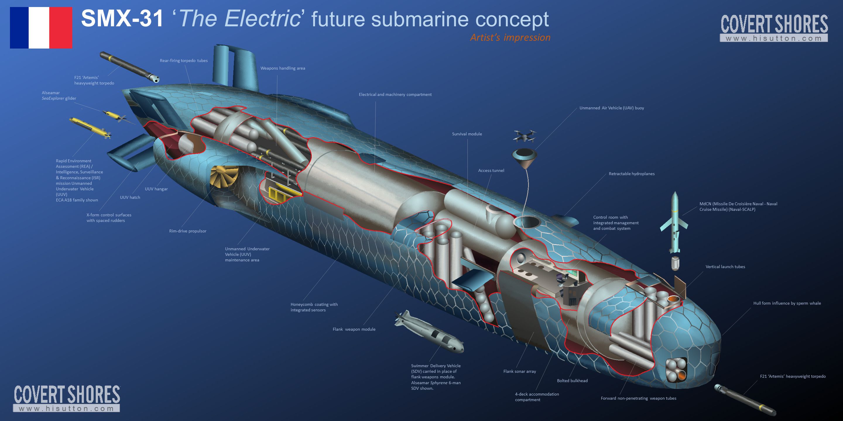 Desde el hangar trasero del submarino saldrán los vehículos no tripulados submarinos. El SMX-31 también puede transportar pequeños vehículos submarinos de transporte, como el Propulsor Sous-Marins de tercera generación, con capacidad para seis personas, utilizado por las fuerzas especiales en misiones de infiltración en zonas costeras.