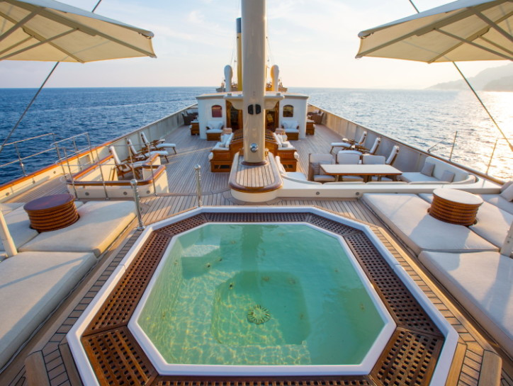Además, el Nero está armado con una batería de juguetes y embarcaciones de recreo para el disfrute de sus pasajeros: 5 motos de agua, dos seabobs, 2 canoas, 2 paddelboards hinchables, un trampolín hinchable, equipos de pesca y submarinismo y dos embarcaciones auxiliares de nueve y ocho metros de eslora cada una, entre otras.