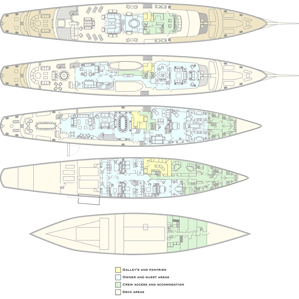 Los camarotes para los invitados se encuentra en la cubierta inferior. Allí, dos suites se encuentran a proa y popa, separadas por dos camarotes para dos personas. La suite de proa cuenta con dormitorio, sala de estar y baño con spa. La de popa, con dormitorio, sala de estar y dos baños separados por un vestidor. Los camarotes para la tripulación se encuentran a proa tanto de la cubierta principal como de la inferior.