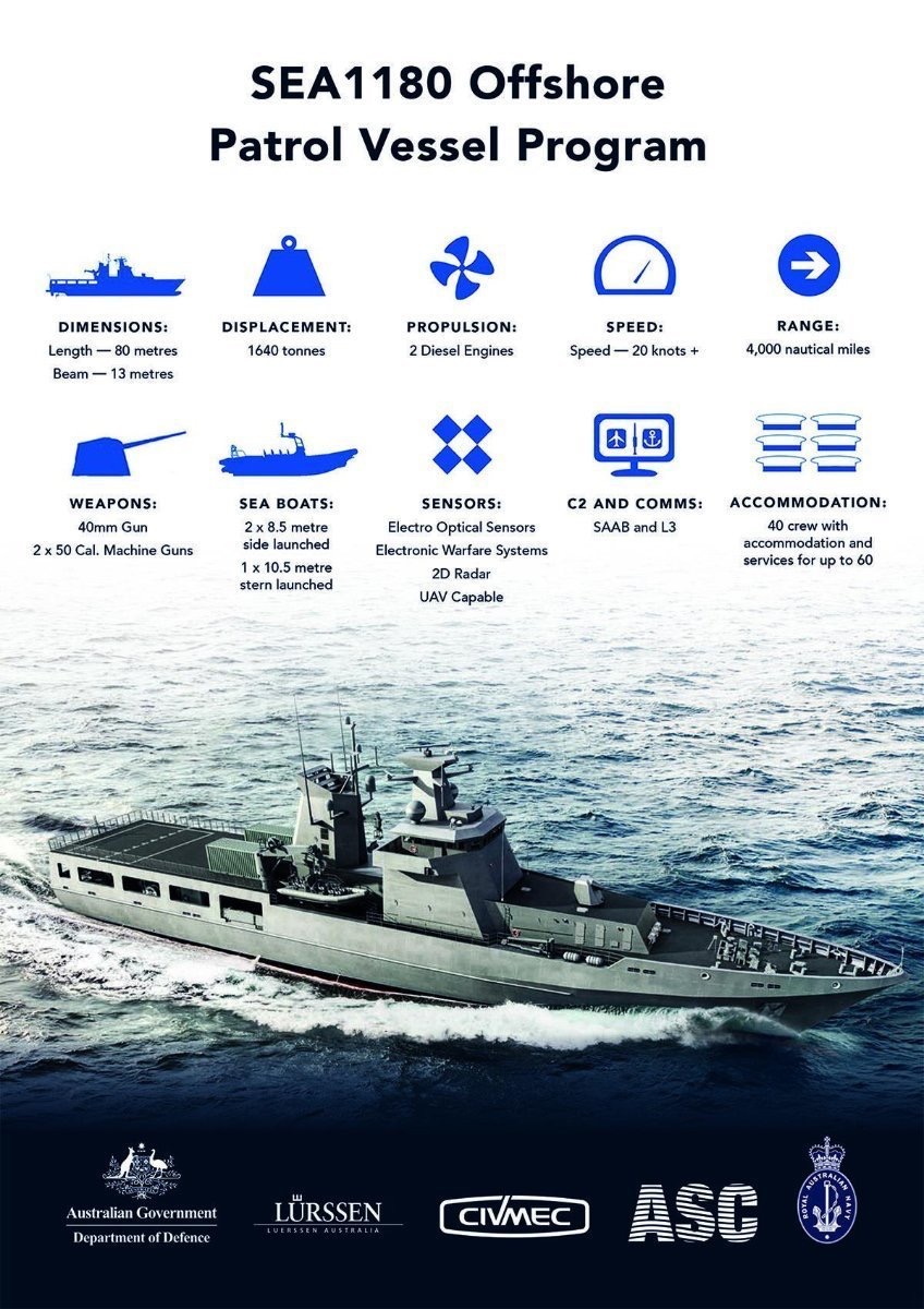 Los doce nuevos buques están basados en el diseño PV80 de Lürssen. Los dos primeros de la clase se construirán en el astillero de ASC en Osborne en Australia del Sur, mientras que los diez restantes lo harán en Civmec, en Henderson (Australia Occidental),