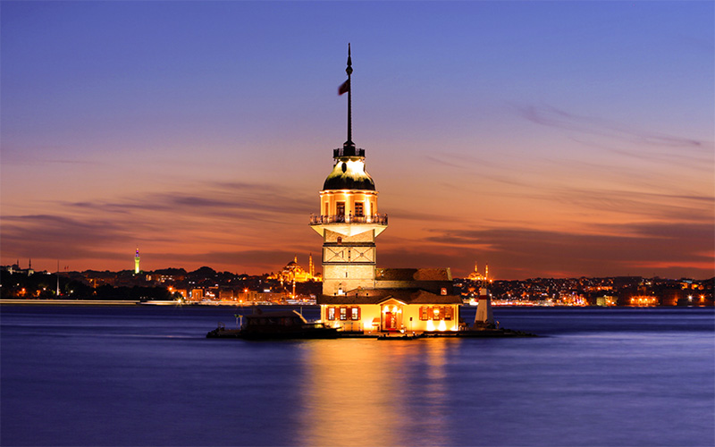 Situada en un pequeño islote en la entrada sur del Estrecho del Bósforo frente a la ciudad de Estambul, la Torre de la Doncella (Kız Kulesi, en turco) original data del año 408. Destruida en el terremoto de 1509 e incendiada en 1721, se ha usado desde entonces como faro. Su última restauración tuvo lugar en 1998 para el rodaje de la película del agente 007 El mundo nunca es suficiente, y tras el terremoto de 1999 se le añadieron soportes de acero a su alrededor por precaución. Hoy en día el interior de la torre funciona como una cafetería y restaurante con unas envidiables vistas a la antigua capital romana, bizantina y otomana.