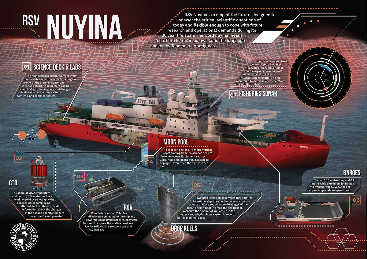 El Nuyina proporcionará una plataforma de vanguardia para realizar estudios científicos multidisciplinares, tanto entre el hielo marino como en aguas abiertas. También transportará personal, carga y equipo desde y hacia las estaciones antárticas y subantárticas.