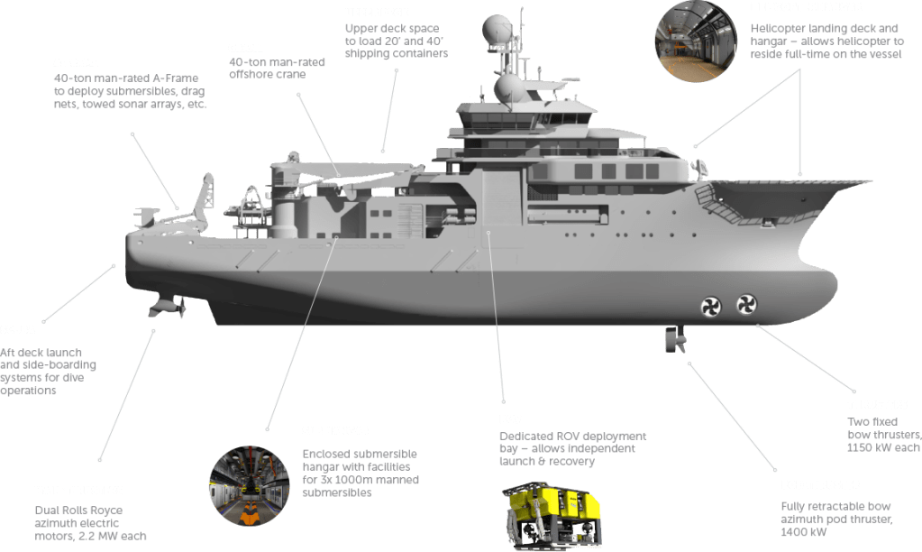 El pozo lunar abierto en el centro del Volstad Surveyor para sus tareas como buque offshore fue cerrado, se instalaron aletas estabilizadoras en cada banda y en popa, el nuevo A-frame permite el despliegue de vehículos operados remotamente y de los dos submarinos embarcados, capaces de alcanzar profundidades de 1.000 metros bajo el nivel del mar. En proa, el helipuerto y el hangar permiten operar un helicóptero para misiones de reconocimiento y fotografía aérea, todo ello completado con una habilitación para los 85 técnicos e investigadores a la altura de los mejores superyates.