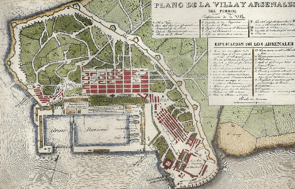 La vía de agua de La Sensible acabó con la comitiva de los Adams en Ferrol, a más de 1.500 kilómetros por tierra de París. Treinta años antes, el 9 de abril de 1749, Fernando VI mandó iniciar la construcción del Real Astillero de Esteiro. Finalizado en 1756, para 1779 ya se habían construido más de 65 buques de guerra en el mismo. De la misma época era la construcción del Arsenal militar. Y en 1761 Carlos III había ordenado la construcción del barrio de la Magdalena, convirtiendo una villa de pescadores de 1.000 habitantes a mediados del siglo XVIII en una ciudad ejemplo de la Ilustración de 20.000 habitantes para finales del siglo.