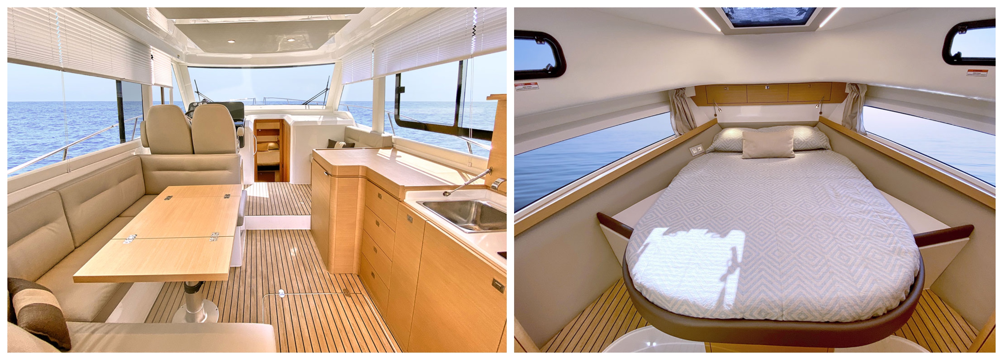 En cuanto a su organización, en estribor se encuentra su elegante cocina y en babor, su mesa y sofá en forma de C. El puesto de mando interior se ubica en babor de proa. El camarote principal con litera doble y armario colgante está en proa de la cubierta inferior y el camarote de invitados tiene forma de L.