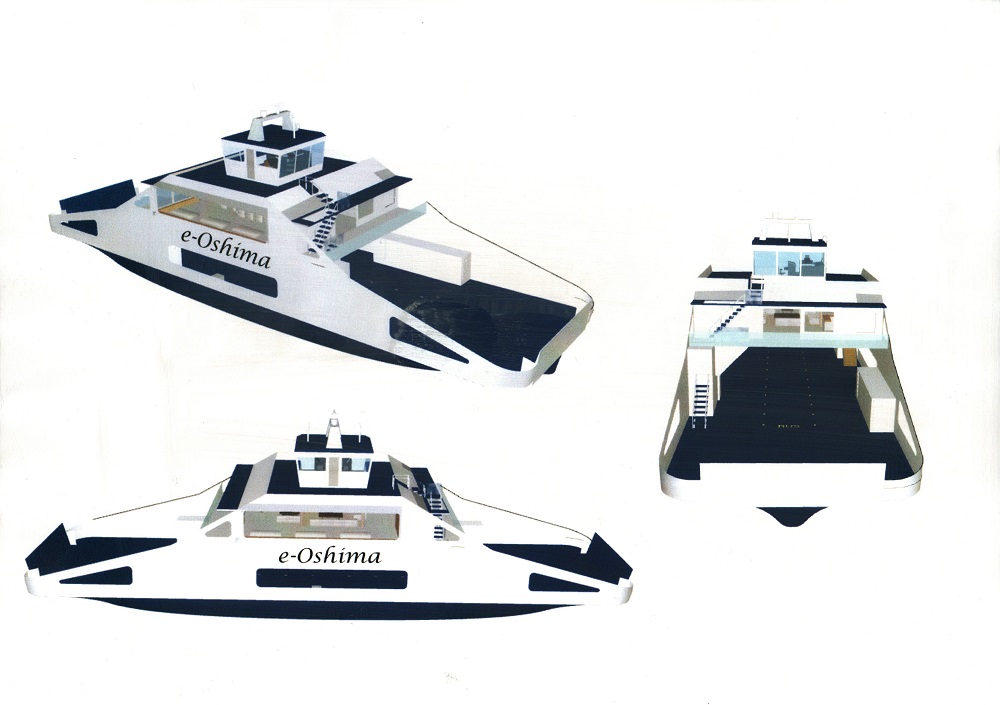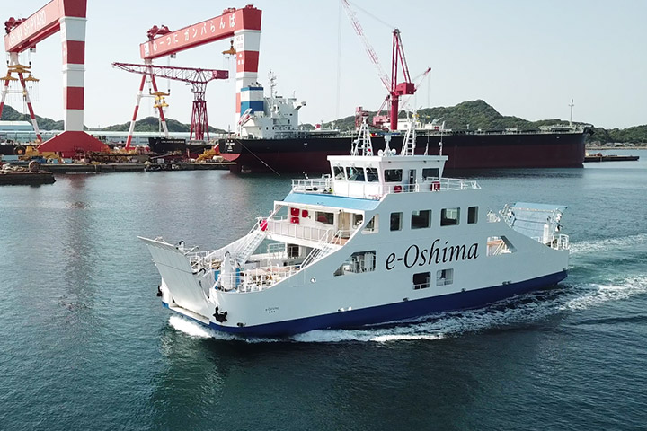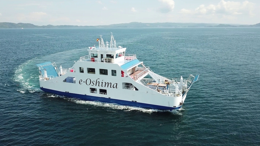 Puesto en funcionamiento en junio de 2019, el e-Oshima es uno de los barcos eléctricos más grandes de Japón. Sus 340 toneladas de desplazamiento, encajadas en 35 metros de eslora por 9,60 metros de manga, son movidas por dos propulsores azimutales alimentados por dos motores eléctricos, que obtienen su energía de un banco de baterías de iones de litio de 600 kWh del fabricante GS Yuasa. Gracias a esto, la operación del barco es totalmente silenciosa, sin vibraciones y sin emisiones de efecto invernadero a la atmósfera, mejorando tanto la experiencia de usuario de los pasajeros como los efectos del barco en el medio ambiente.