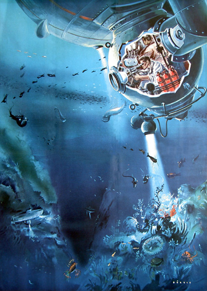 Dos de los artistas más destacados de la época fueron Arthur Radebaugh (al que ya le dedicamos una entrada en el blog) y Klaus Bürgle. Bürgle nació en Stuttgart en 1926, y tras graduarse en la Academia Estatal de Bellas Artes en 1951 se especializó en ilustraciones de temas científico-técnicos, creando imágenes de portada para un gran número de libros y revistas de divulgación científica.