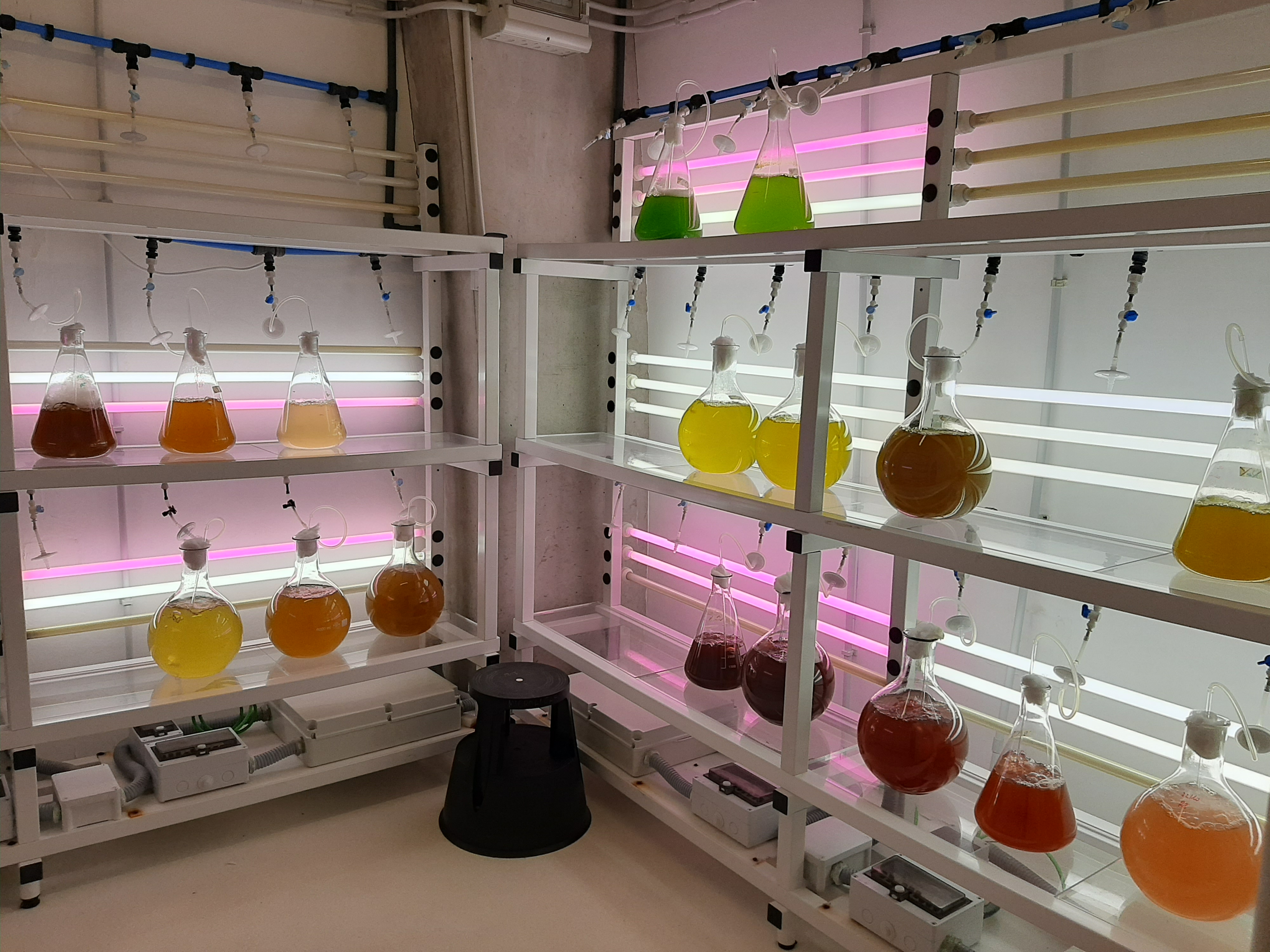 Su tía, que había presenciado la conversación, me comentó divertida que a Mara le gustaría ser escritora, que escribe un montón de cosas… y, con esto en la cabeza, seguimos nuestra ruta a través de laboratorios con erizos, mejillones, rodaballos, algún que otro congelador criogénico, salas para el crecimiento de muy diversas microalgas (las salas que, al parecer, más llaman la atención a todo el mundo) y una considerable sala de bombas con sus tanques de decantación y sus filtros de arena, de donde se obtiene el agua de mar filtrada necesaria para la mayoría de los estudios.