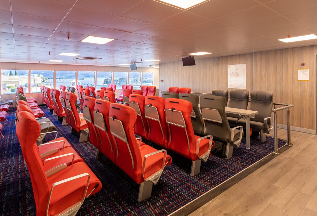 Los pasajeros pueden disfrutar a bordo de cafetería, wifi, zona infantil, espacios para mascotas, servicio digital de entretenimiento a bordo (prensa, juegos, reportajes y TV) y terraza exterior. Los viajeros de clase Premium tiene acceso exclusivo a una zona Premium, salón y terraza privado, butacas extra-comodidad y servicio de restauración y bebida incluido en su billete. El nuevo fast ferry se une así a su gemelo Volcán de Tagoro en la ruta que une las ciudades de Las Palmas de Gran Canaria y Santa Cruz de Tenerife en tan solo 1 hora y 40 minutos.