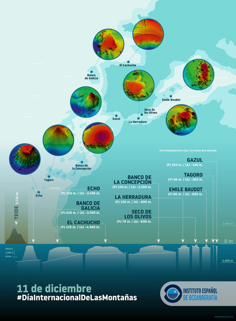 El IEO ha participado y liderado multitud de proyectos nacionales e internacionales dedicados al estudio de las montañas submarinas desde un punto de vista multidisciplinar, principalmente en España pero también en lugares tan remotos como la Antártida. Ocultas bajo el océano que nos rodea, se encuentran algunas de las montañas más singulares del país. Las hay de origen volcánico, tectónico o formadas por acumulaciones de materiales sedimentarios. Algunas fueron islas en algún momento de su historia y otras siempre se han mantenido sumergidas. La variedad de tamaños y formas de las montañas submarinas es enorme, pero todas tienen en común que albergan una extraordinaria biodiversidad y generan en sus inmediaciones una gran productividad.