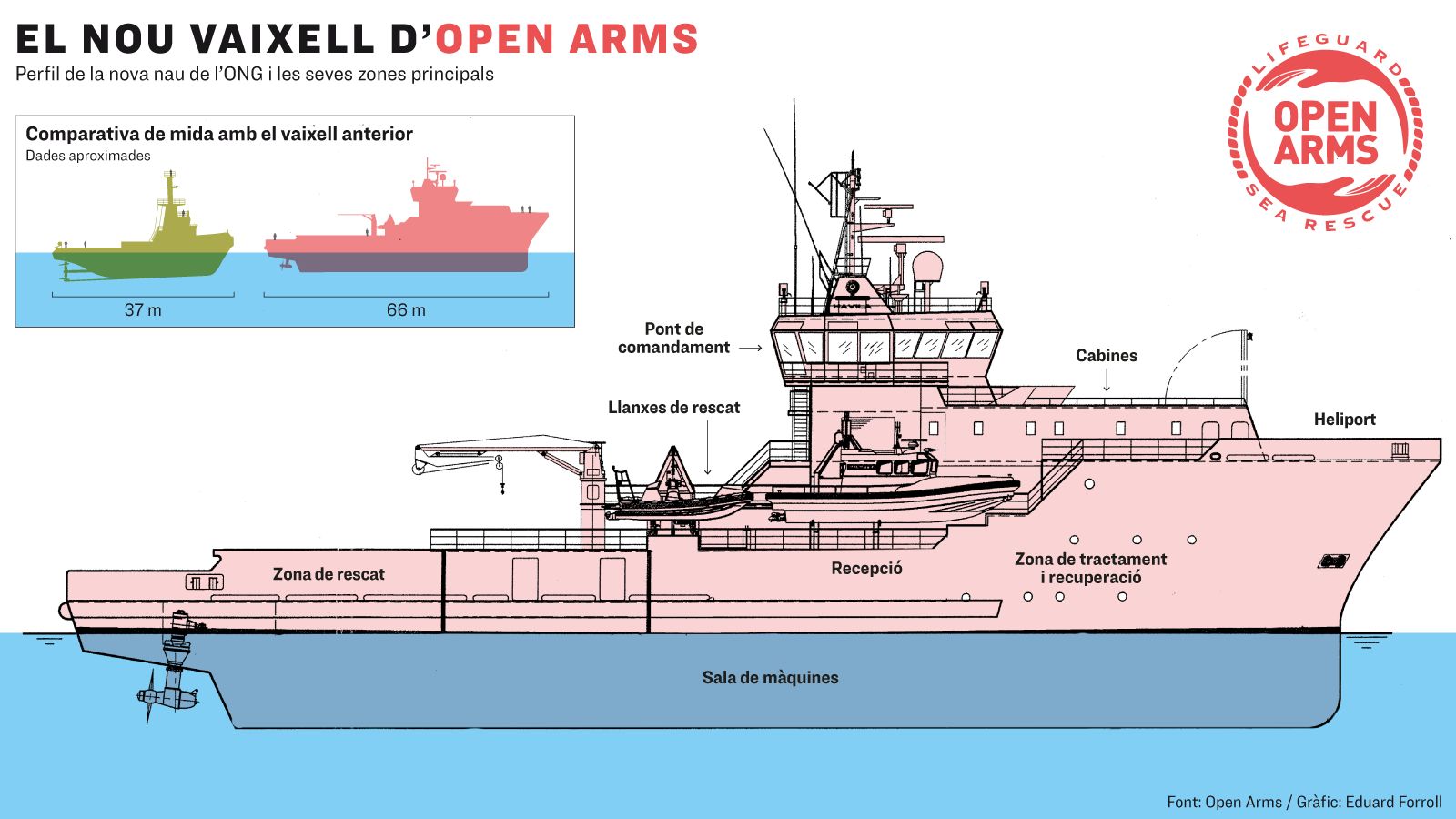 El Ocean Spey fue trasladado a Borriana, en donde se realizaron los trabajos para acomodarlo a su nueva misión. Construido en el año 2000 en el astillero Ulstein Verft de Noruega, siguiendo el diseño UT 719, el buque fue bautizado originalmente como Havila Star. Con unas dimensiones de 66 metros de eslora por 15 metros de manga, es cuatro veces más grande que el viejo Open Arms. El buque cuenta con una cubierta de trabajo de 353 metros cuadrados en la que podría aterrizar un helicóptero en caso de emergencia y evacuación.