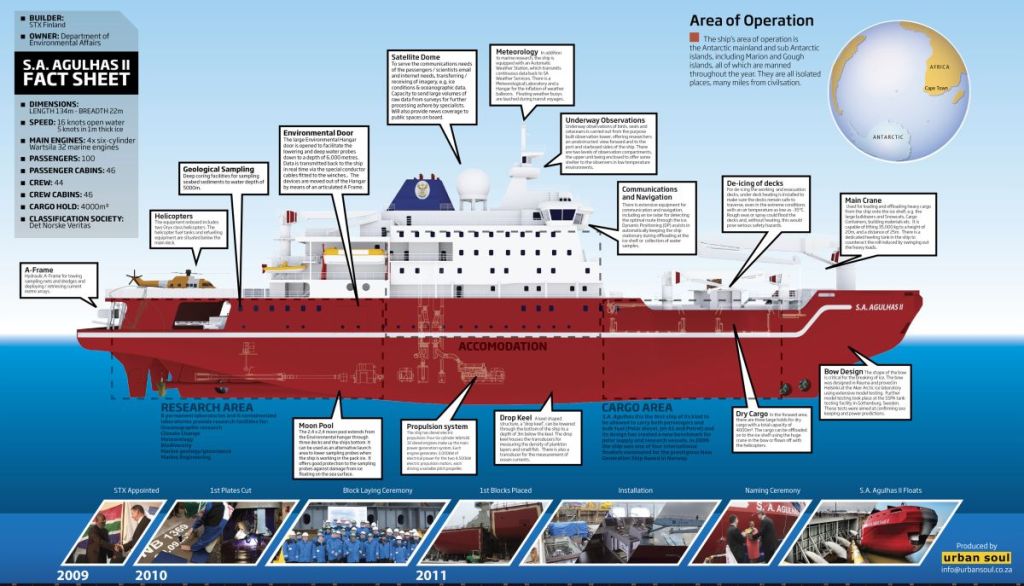El espacio del buque dedicado a la investigación alcanza los 800 metros cuadrados entre los ocho laboratorios del buque y los seis laboratorios contenedorizados que puede llevar sobre su cubierta, que cubren campos como la investigación marina, medioambiental, biológica y climática. Desde una gran puerta en el costado del buque o desde su pozo lunar de 2,4 por 2,4 metros pueden lanzarse al agua diferentes equipos científicos o vehículos a control remoto, y una quilla retráctil capaz de sumergirse tres metros por debajo del fondo del buque está equipada con transductores para medir la densidad del plancton y las corrientes marinas. En la proa del buque está colocada una bodega de 4.000 metros cúbicos en donde se transportan los suministros para las estaciones antárticas. El S. A. Agulhas II cuenta también con un hangar y una plataforma de helicópteros capaz de operar dos helicópteros Atlas Oryx o Aérospatiale SA 330 Puma. Dos embarcaciones rápidas completan el equipamiento del buque.