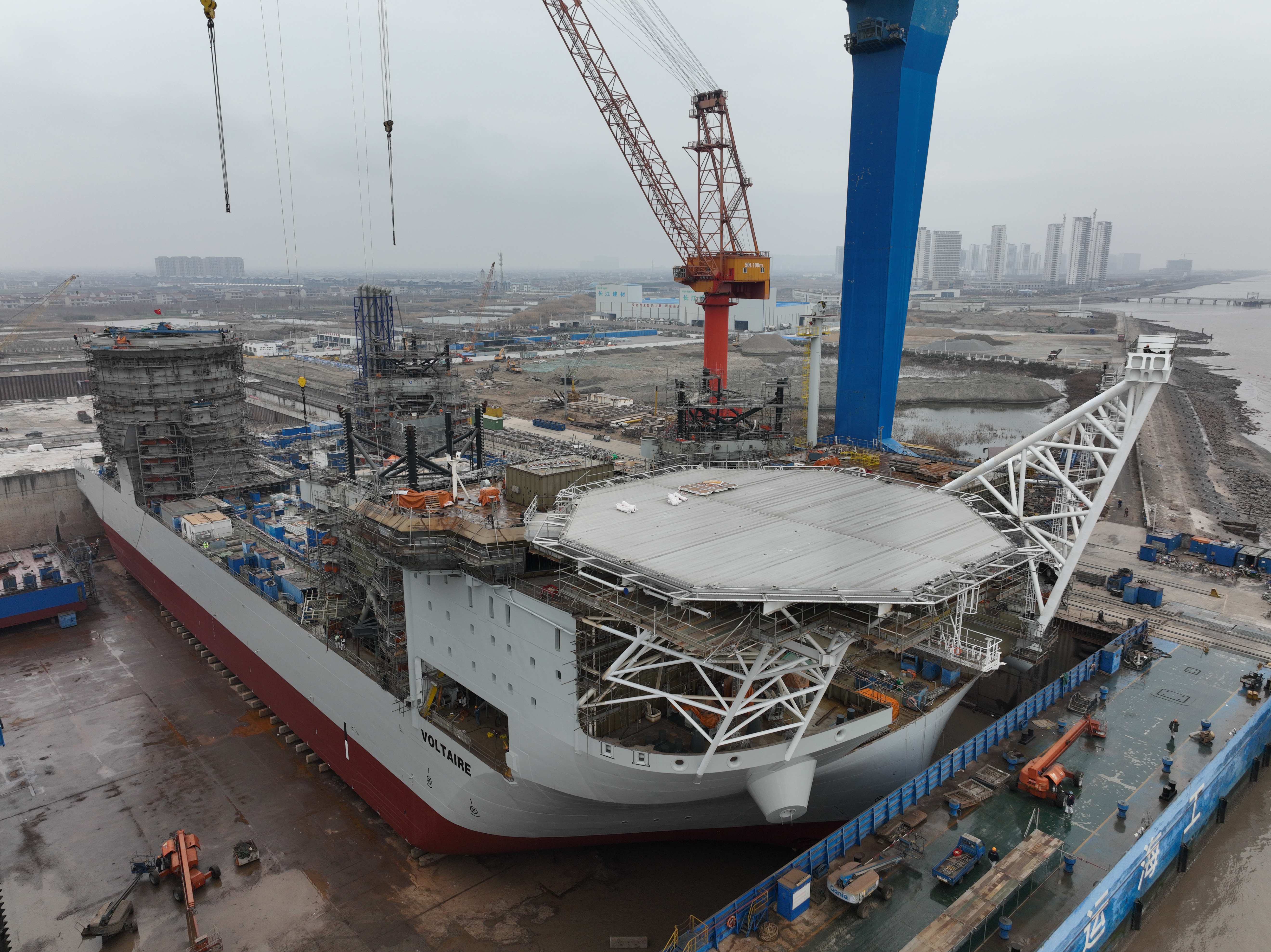Durante los dos últimos años en el astillero COSCO Shipping Shipyard de Nantong (China) se ha construido el Voltaire, que con una altura máxima de 325 metros es el buque instalador de turbinas eólicas más alto del mundo. Con una eslora de 182 metros y 60 metros de manga, el buque cuenta con una cubierta de transporte de 7.000 metros cuadrados capaz de transportar hasta 14.000 toneladas de carga y espacio en su interior para 100 personas.