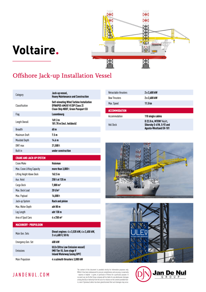 Gracias a sus enormes patas de 130 metros de alto, el Voltaire puede elevarse hasta 80 metros por encima del nivel del mar, creando una plataforma segura desde la que instalar componentes eólicos en alta mar. Sobre la cubierta se sitúa la grúa principal capaz de levantar cargas de hasta 3.000 toneladas de peso 162,5 metros por encima de la cubierta, lo que permitirá al Voltaire enfrentarse a la construcción de las próximas generaciones de turbinas eólicas marinas.