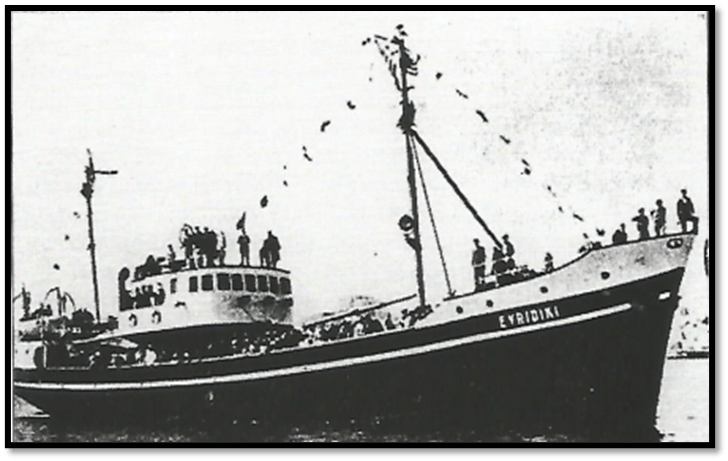 (3) Las características del “Evridiki” eran, Eslora : 38 m. Manga : 6.8 m. TRB : 400 t. HP : 450 cv. Velocidad :11 nudos. Capacidad de Congelación : 7 ton/día. Capacidad de Carga : 130 tons. Sistema de Congelación : Túneles.
