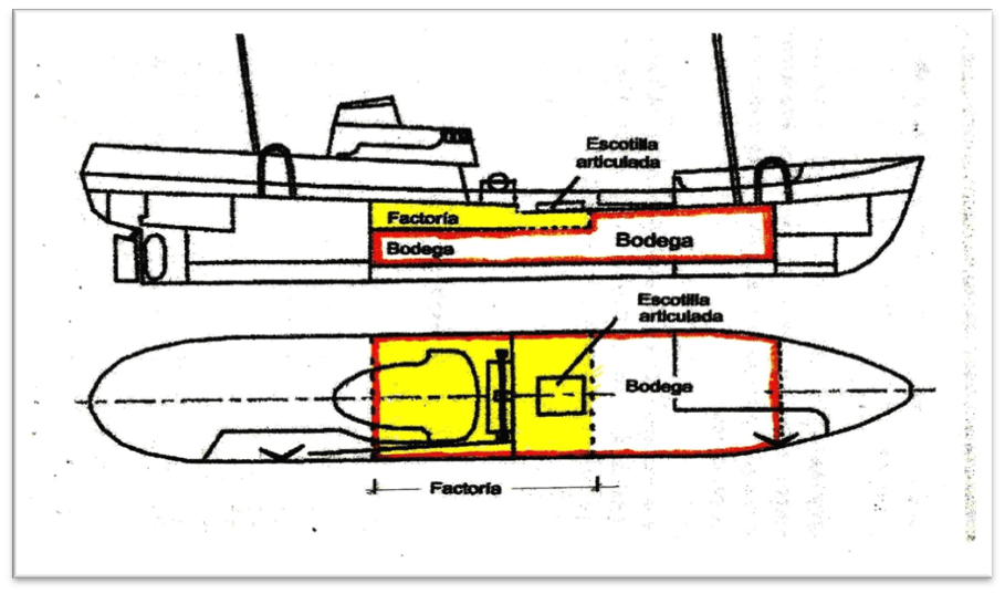 La idea fundamental era que la maniobra de pesca no interfiriese en la manipulación de esta. La solución hallada fue la incorporación de una nueva cubierta, como en el caso de los ramperos, aunque a diferencia de estos, no era una cubierta corrida de popa a proa, destinando la superior para realizar solamente las maniobras dirigidas a operaciones de pesca. La cubierta inferior, inmediatamente debajo de la de pesca, supuso un parque para manipulación del pescado, protegido de la intemperie, en el que la pesca era recibida directamente desde el copo del arte a través de una escotilla con tapa articulada. En esta nueva cubierta, además de las máquinas de procesamiento como descabezadoras, lavadoras o fileteadoras, se encontraban también los túneles y armarios de congelación, cuyos compresores hubo que incorporar a la cámara de máquinas. Debajo de esta cubierta de factoría y por encima del doble fondo del buque, se encontraban las bodegas de conservación y almacenamiento de pescado ya tratado, que podía alcanzar los -22ºC. (4)